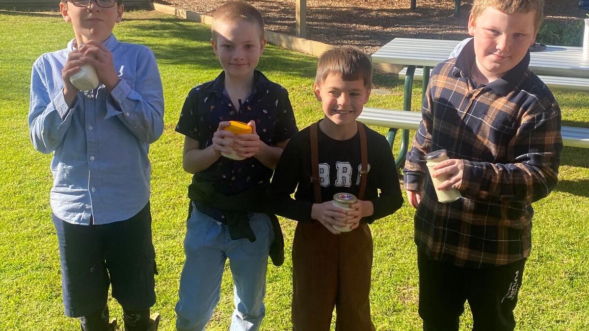 Mayrung students Oliver Dellwo, Steven Busby, Hapuku Clancy and Rylan Aughtie learn how to make butter.
