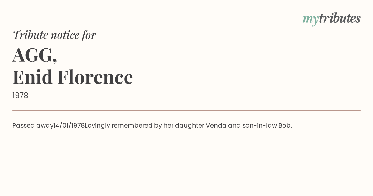 Lovingly remembered by her daughter Venda and son-in-law Bob.