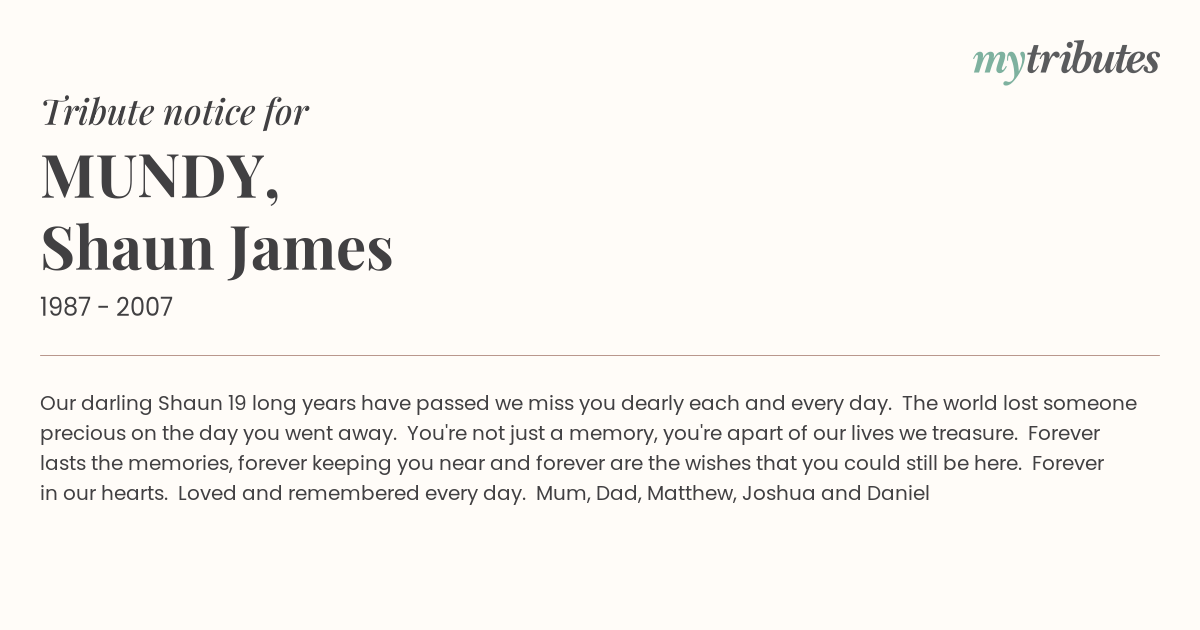 12°COur darling Shaun 19 long years have passed we miss you dearly each and every day. The world lost someone precious on the day you went away. You're not just a memory, you're apart of our lives we treasure. Forever lasts the memories, forever keeping you near and forever are the wishes that you could still be here. Forever in our hearts. Loved and remembered every day. Mum, Dad, Matthew, Joshua and Daniel