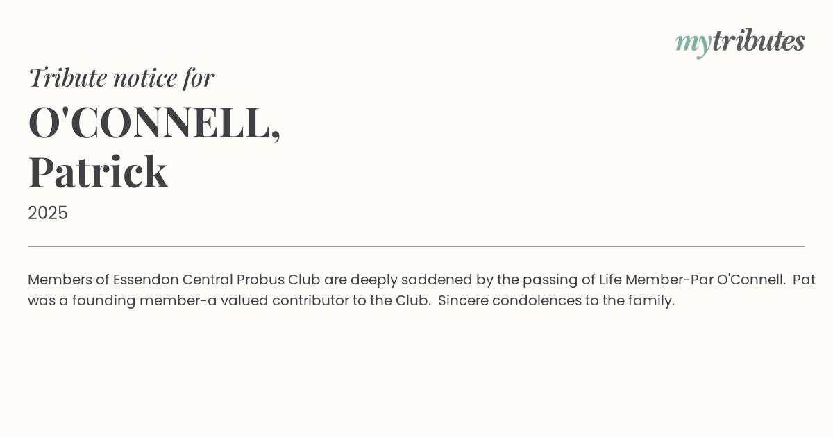 12°CMembers of Essendon Central Probus Club are deeply saddened by the passing of Life Member-Par O'Connell. Pat was a founding member-a valued contributor to the Club.
