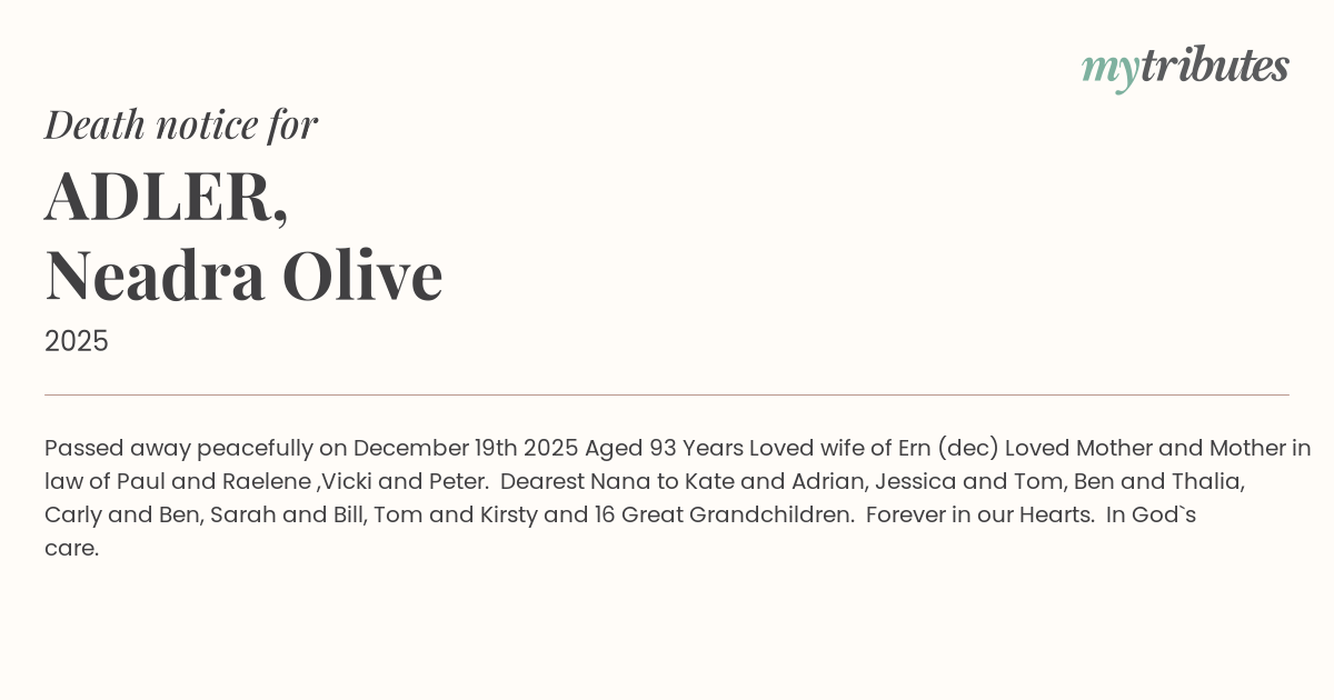12°CPassed away peacefully on December 19th 2025 Aged 93 Years
