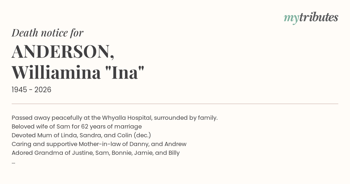 12°CPassed away peacefully at the Whyalla Hospital, surrounded by family.