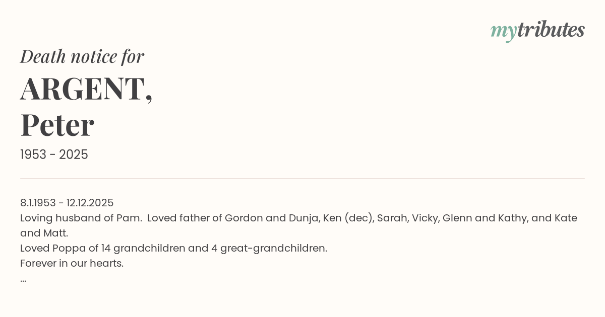 Loving husband of Pam. Loved father of Gordon and Dunja, Ken (dec), Sarah, Vicky, Glenn and Kathy, and Kate and Matt.