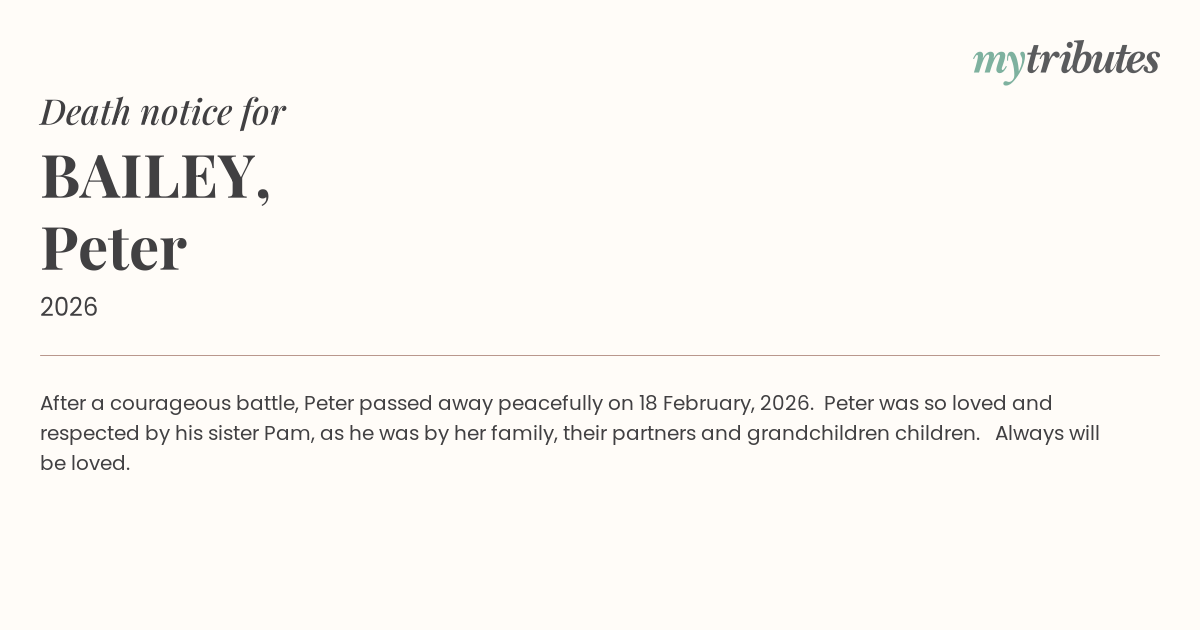 12°CAfter a courageous battle, Peter passed away peacefully on 18 February, 2026. Peter was so loved and respected by his sister Pam, as he was by her family, their partners and grandchildren children. Always will be loved.