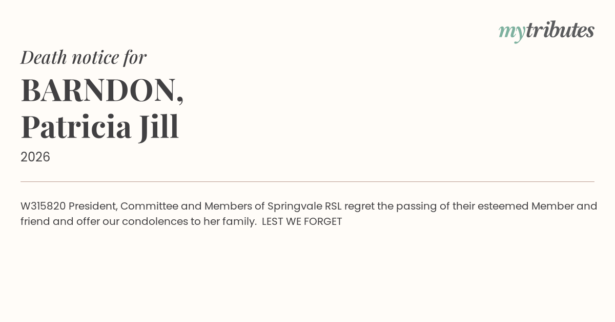 President, Committee and Members of Springvale RSL regret the passing of their esteemed Member and friend and offer our condolences to her family.