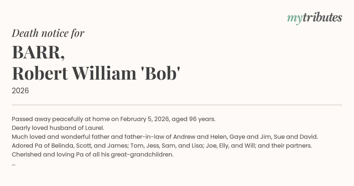 12°CPassed away peacefully at home on February 5, 2026, aged 96 years.