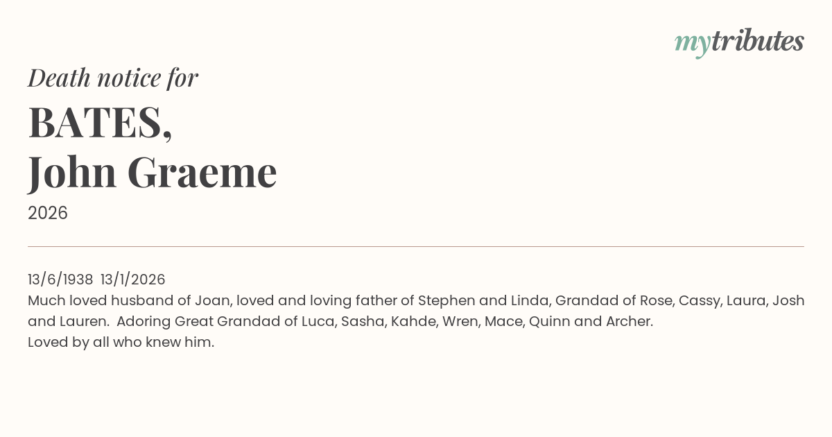 Much loved husband of Joan, loved and loving father of Stephen and Linda, Grandad of Rose, Cassy, Laura, Josh and Lauren. Adoring Great Grandad of Luca, Sasha, Kahde, Wren, Mace, Quinn and Archer.