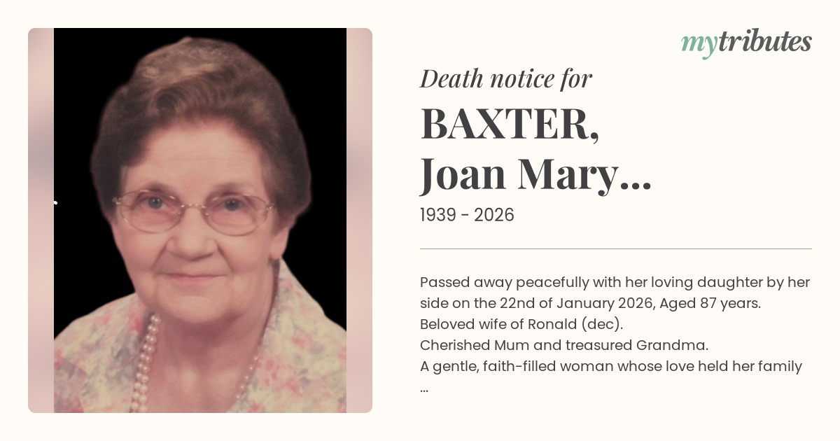 12°CPassed away peacefully with her loving daughter by her side on the 22nd of January 2026, Aged 87 years.
