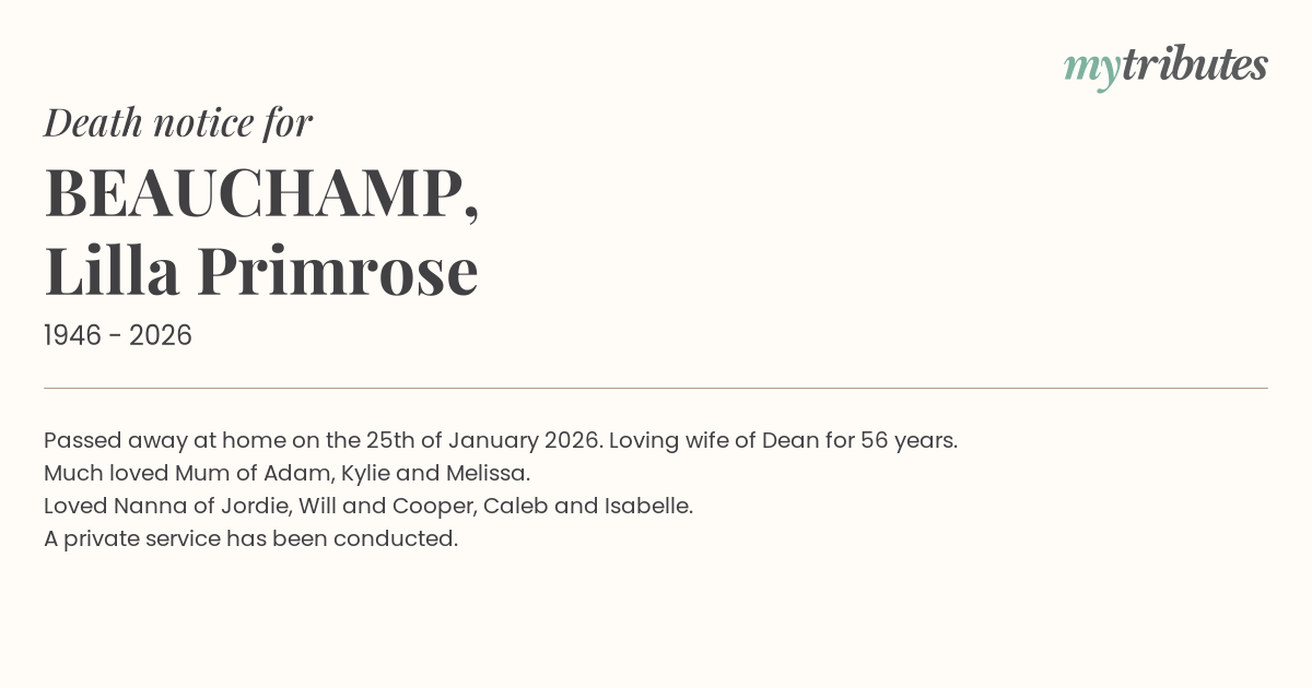 12°CPassed away at home on the 25th of January 2026. Loving wife of Dean for 56 years. Much loved Mum of Adam, Kylie and Melissa. Loved Nanna of Jordie, Will and Cooper, Caleb and Isabelle. A private service has been conducted.