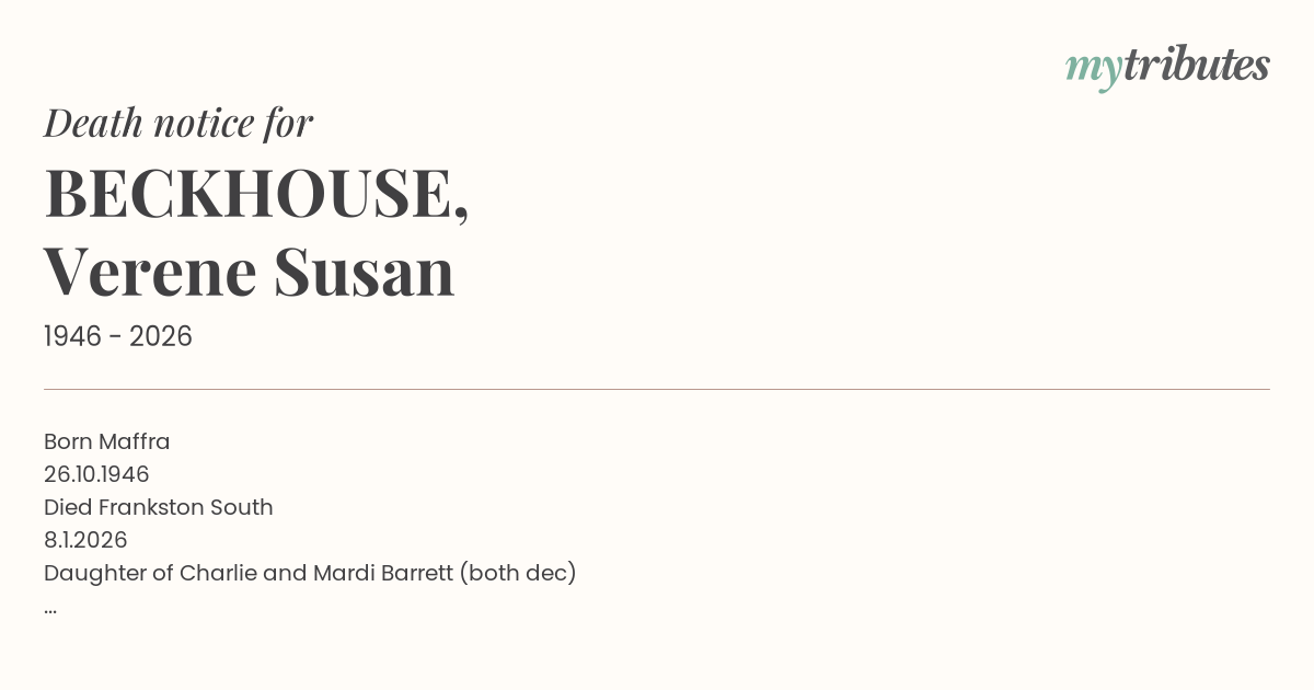 With great sadness we announce the passing of our beloved mother Verene. Verene is survived by daughters Kylee, Tamara and son Anthony. Grandchildren Ryley, Kyan, Mason and Jaida.
