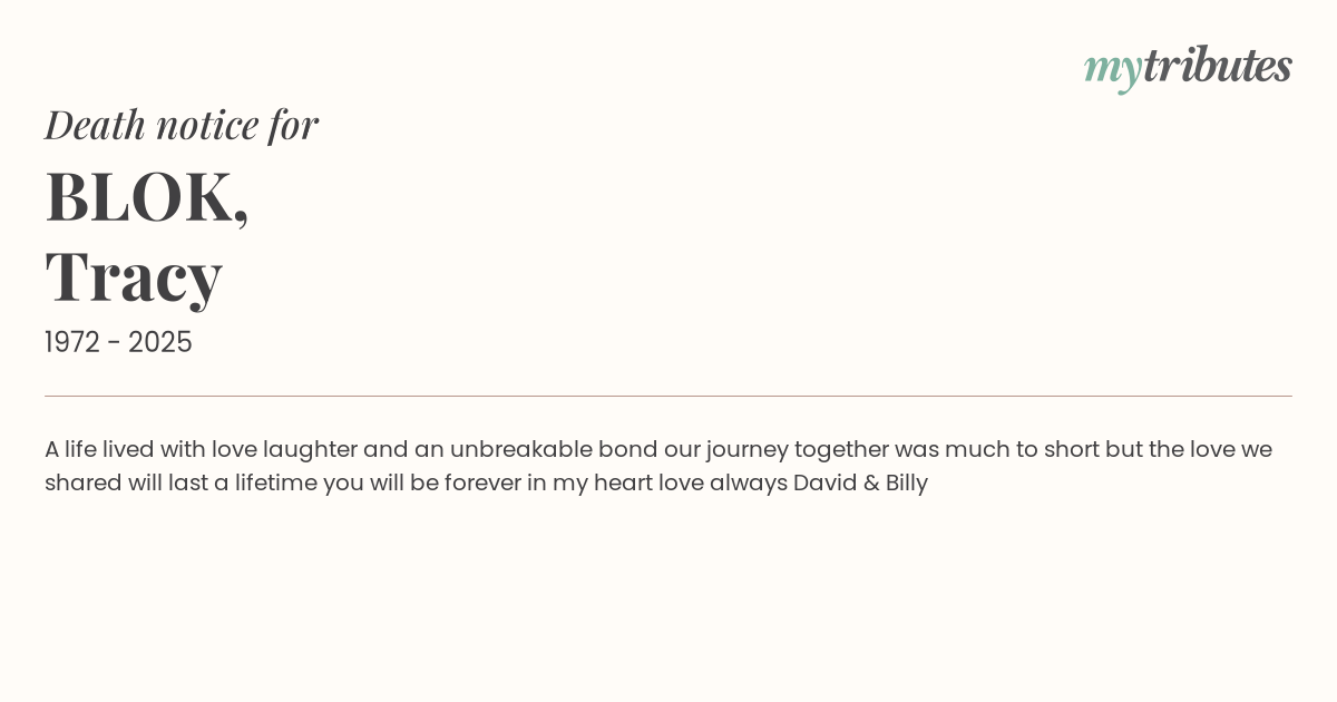 12°CA life lived with love laughter and an unbreakable bond our journey together was much to short but the love we shared will last a lifetime you will be forever in my heart love always David & Billy