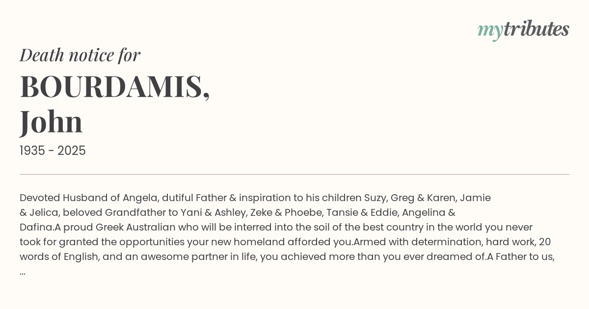 12°CDevoted Husband of Angela, dutiful Father & inspiration to his children Suzy, Greg & Karen, Jamie & Jelica, beloved Grandfather to Yani & Ashley, Zeke & Phoebe, Tansie & Eddie, Angelina & Dafina.