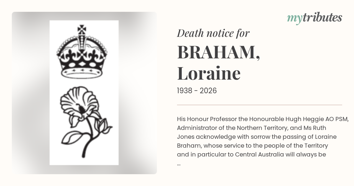 12°CHis Honour Professor the Honourable Hugh Heggie AO PSM, Administrator of the Northern Territory, and Ms Ruth Jones acknowledge with sorrow the passing of Loraine Braham, whose service to the people of the Territory and in particular to Central Australia will always be remembered.
