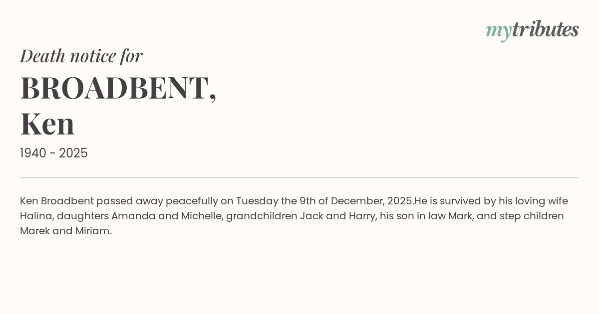 12°CKen Broadbent passed away peacefully on Tuesday the 9th of December, 2025.