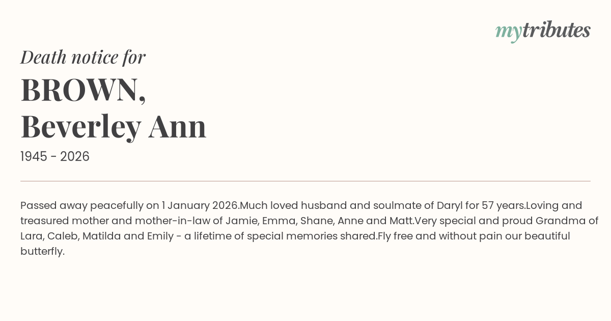 Loving and treasured mother and mother-in-law of Jamie, Emma, Shane, Anne and Matt.