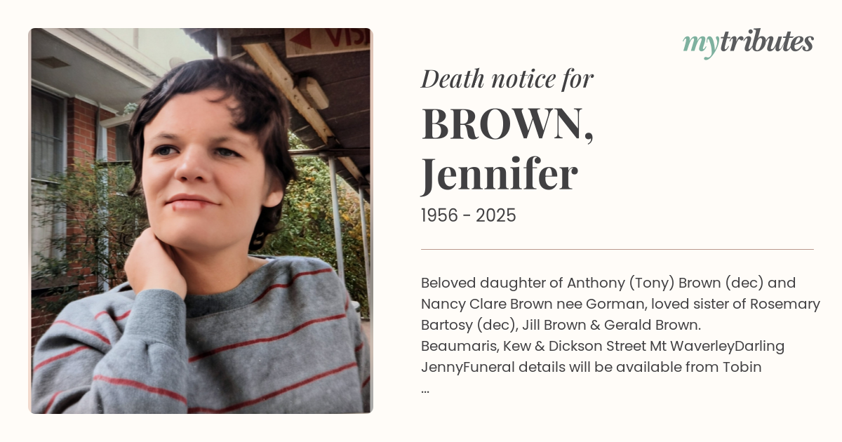 12°CBeloved daughter of Anthony (Tony) Brown (dec) and Nancy Clare Brown nee Gorman, loved sister of Rosemary Bartosy (dec), Jill Brown & Gerald Brown.