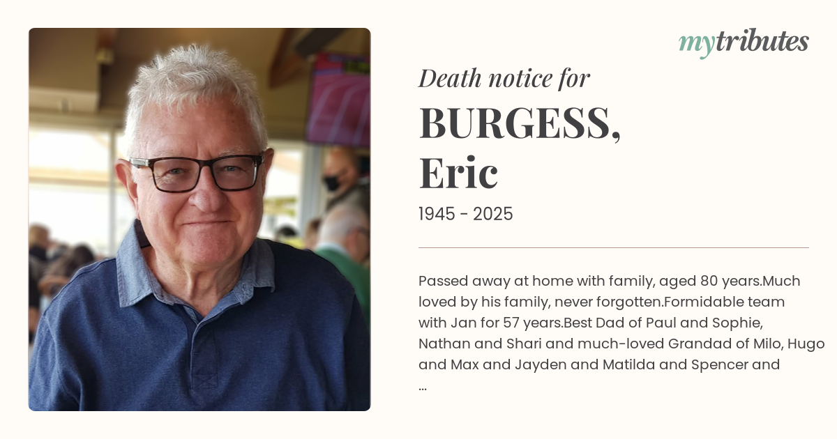 The family would like to thank all of Eric’s doctors and care teams who treated him with love, dignity and respect over the past years, and a special thanks to sister Maree, for all your love and support over the past week. It means more than you can know.