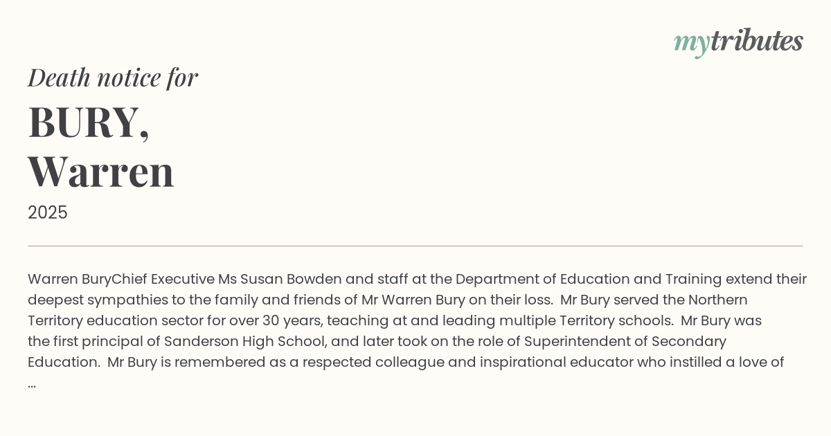 Chief Executive Ms Susan Bowden and staff at the Department of Education and Training extend their deepest sympathies to the family and friends of Mr Warren Bury on their loss.