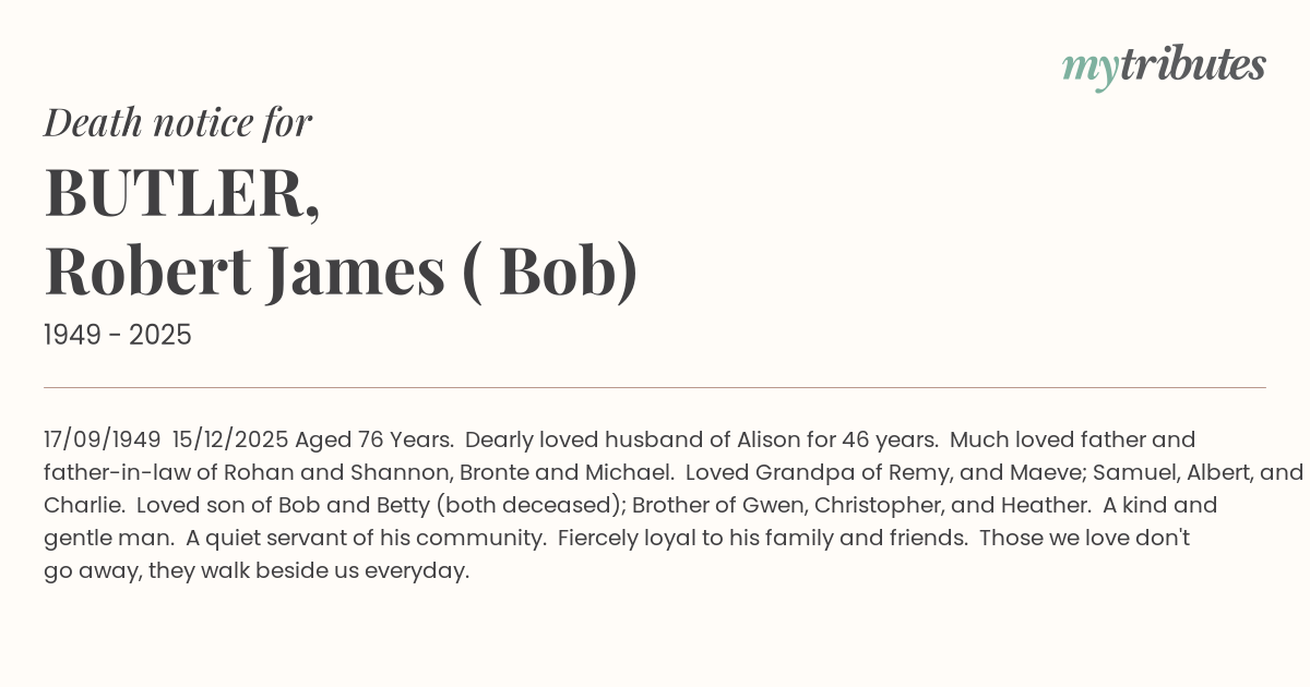 12°C17/09/1949 – 15/12/2025 Aged 76 Years. Dearly loved husband of Alison for 46 years. Much loved father and father-in-law of Rohan and Shannon, Bronte and Michael. Loved Grandpa of Remy, and Maeve; Samuel, Albert, and Charlie. Loved son of Bob and Betty (both deceased); Brother of Gwen, Christopher, and Heather. A kind and gentle man. A quiet servant of his community. Fiercely loyal to his family and friends. Those we love don't go away, they walk beside us everyday.