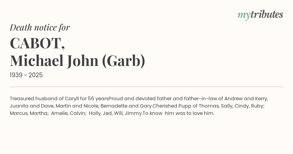 Proud and devoted father and father-in-law of Andrew and Kerry, Juanita and Dave, Martin and Nicole, Bernadette and Gary.