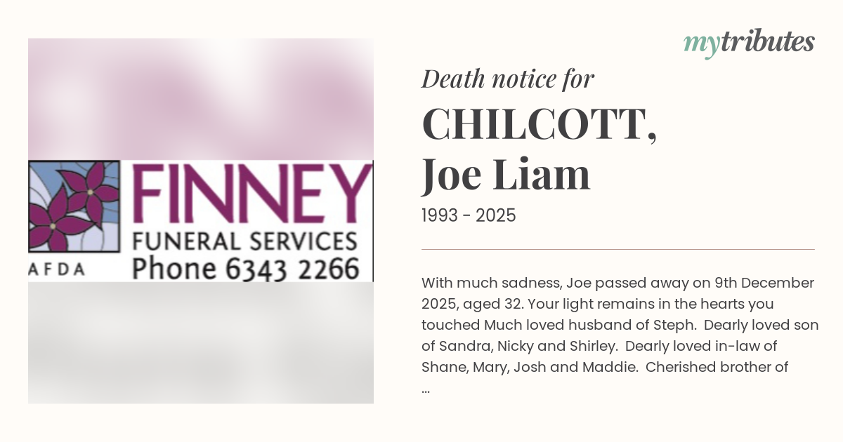 12°CWith much sadness, Joe passed away on 9th December 2025, aged 32. Your light remains in the hearts you touched Much loved husband of Steph. Dearly loved son of Sandra, Nicky and Shirley. Dearly loved in-law of Shane, Mary, Josh and Maddie. Cherished brother of Matthew and his wife Jaimie, and Carmel and her partner Luke, and Stepsister Tarlia. Adored uncle of Ella and Regan. Adored grandson of Harley and Ralph (dec.) and Brian and Margaret (dec.).