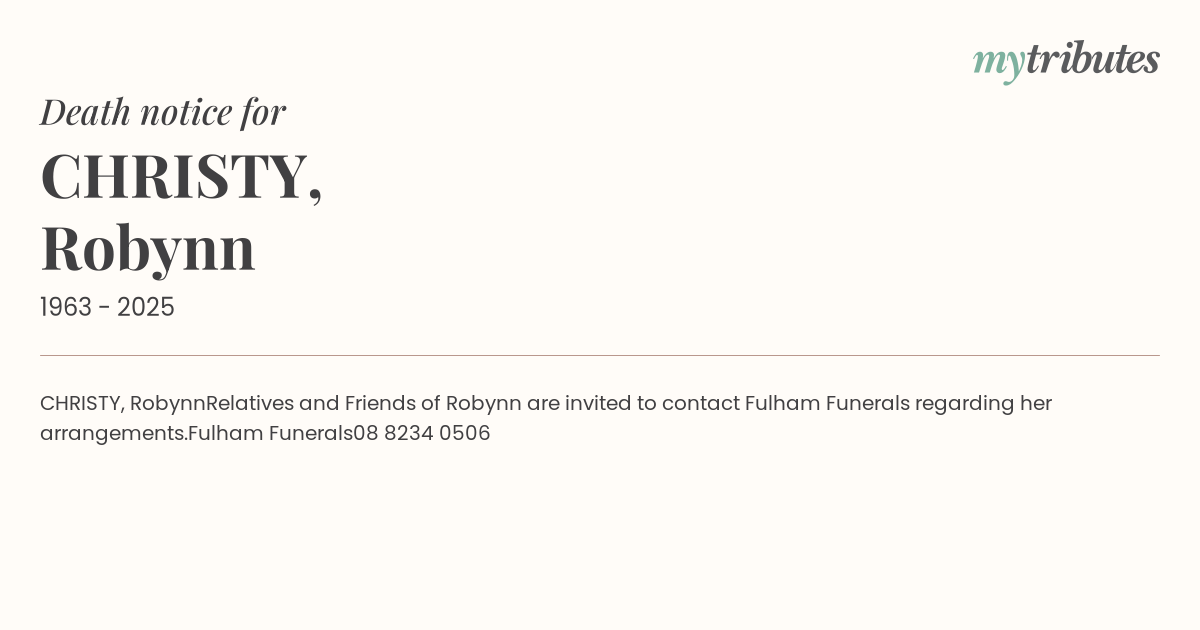 Relatives and Friends of Robynn are invited to contact Fulham Funerals regarding her arrangements.