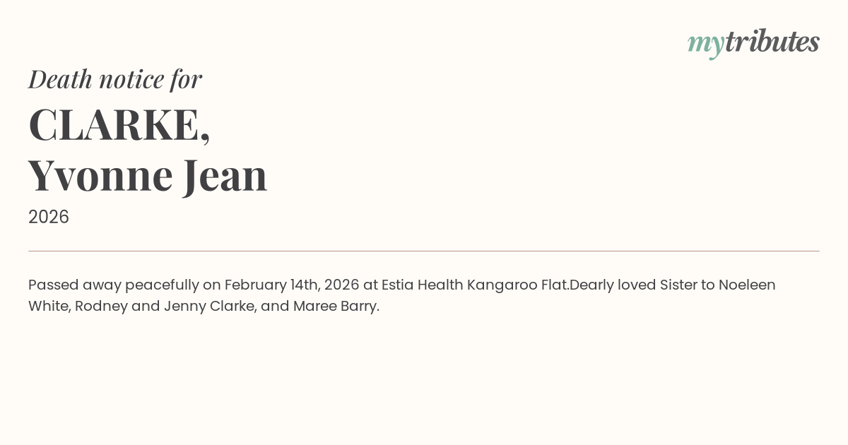 12°CPassed away peacefully on February 14th, 2026 at Estia Health Kangaroo Flat.