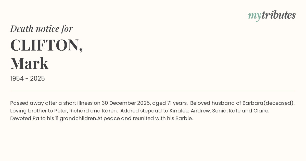 12°CPassed away after a short illness on 30 December 2025, aged 71 years. Beloved husband of Barbara(deceased). Loving brother to Peter, Richard and Karen. Adored stepdad to Kirralee, Andrew, Sonia, Kate and Claire. Devoted Pa to his 11 grandchildren.