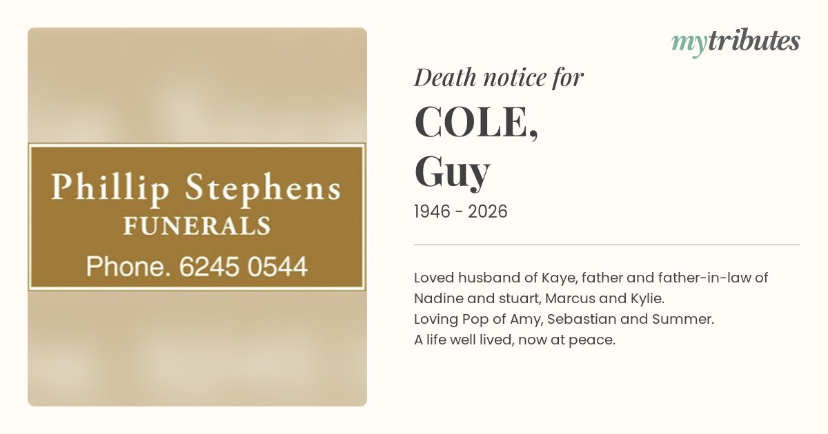 12°CLoved husband of Kaye, father and father-in-law of Nadine and stuart, Marcus and Kylie.