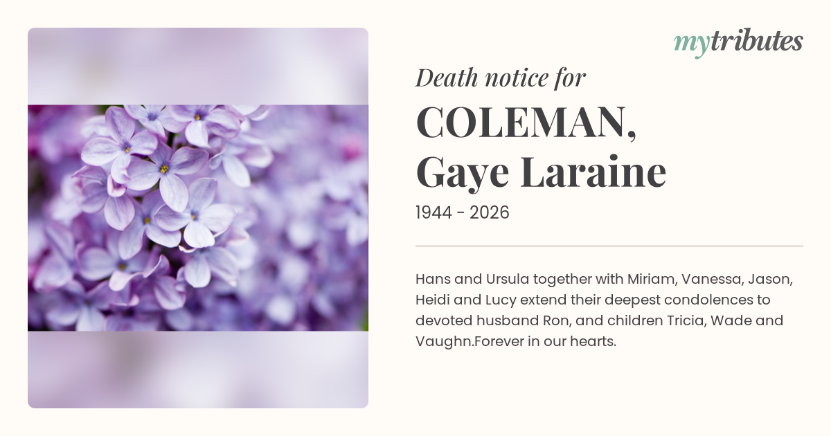 12°CHans and Ursula together with Miriam, Vanessa, Jason, Heidi and Lucy extend their deepest condolences to devoted husband Ron, and children Tricia, Wade and Vaughn.