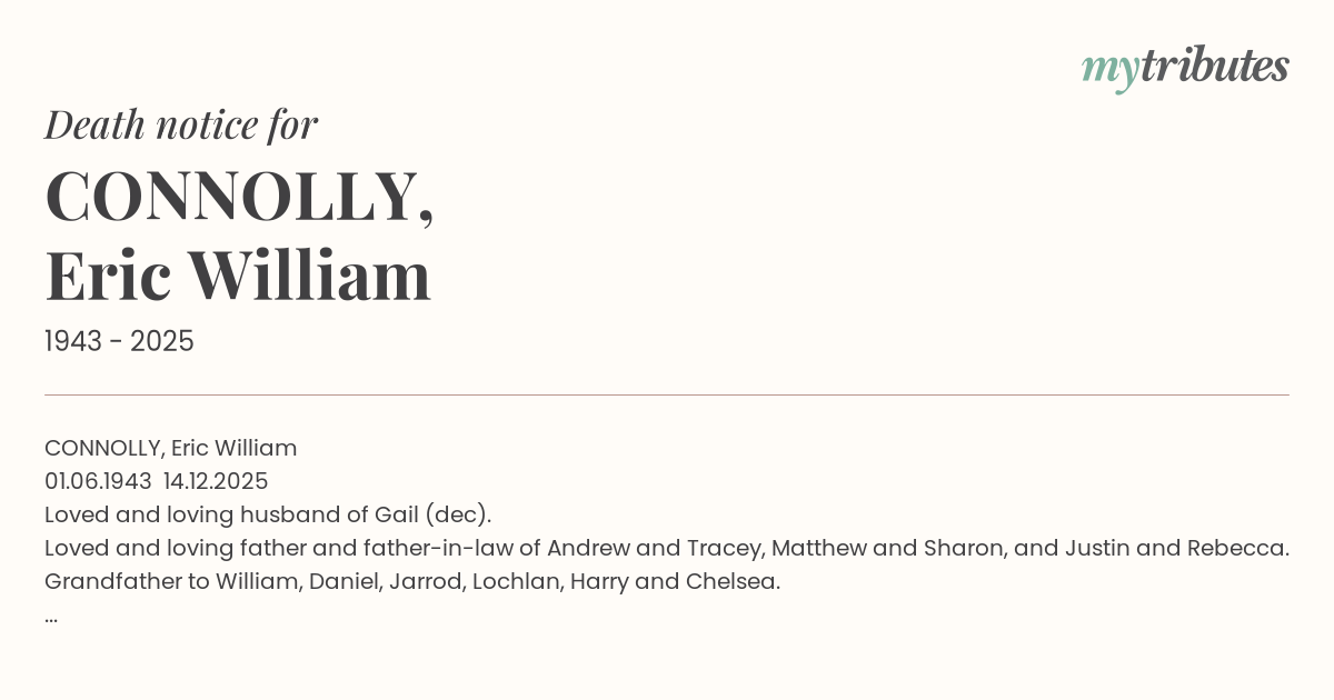 Grandfather to William, Daniel, Jarrod, Lochlan, Harry and Chelsea.