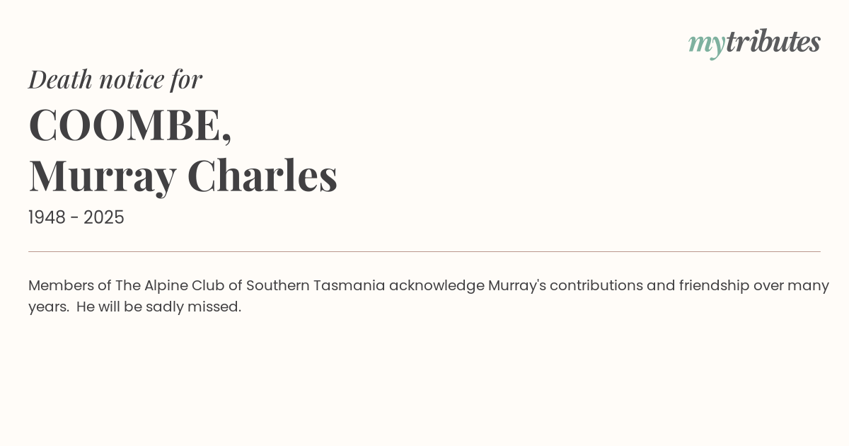 12°CMembers of The Alpine Club of Southern Tasmania acknowledge Murray's contributions and friendship over many years. He will be sadly missed.