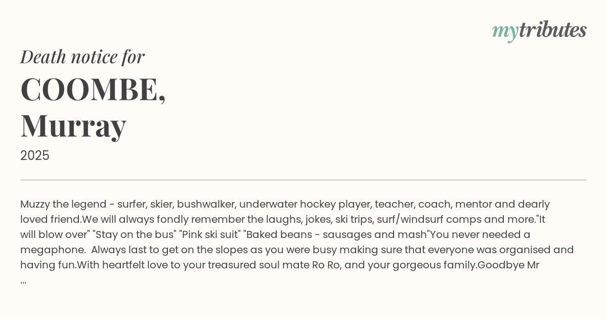 12°CMuzzy the legend - surfer, skier, bushwalker, underwater hockey player, teacher, coach, mentor and dearly loved friend.