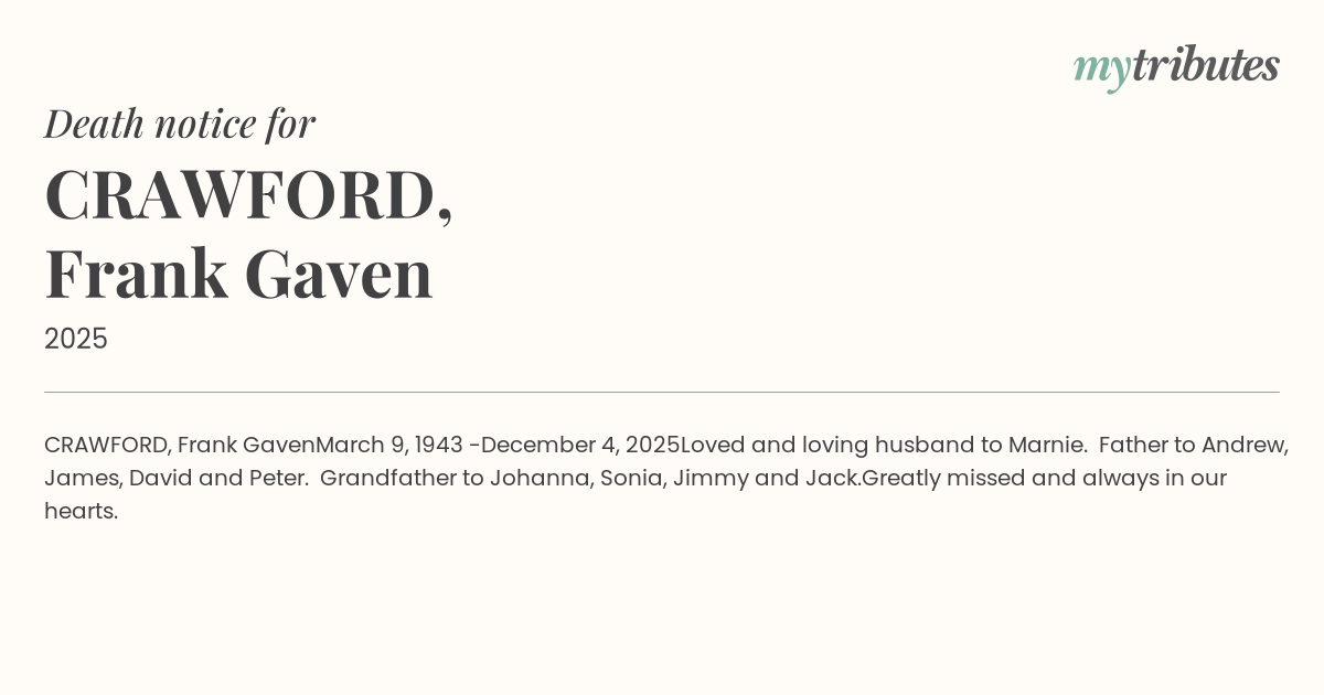 Loved and loving husband to Marnie. Father to Andrew, James, David and Peter. Grandfather to Johanna, Sonia, Jimmy and Jack.