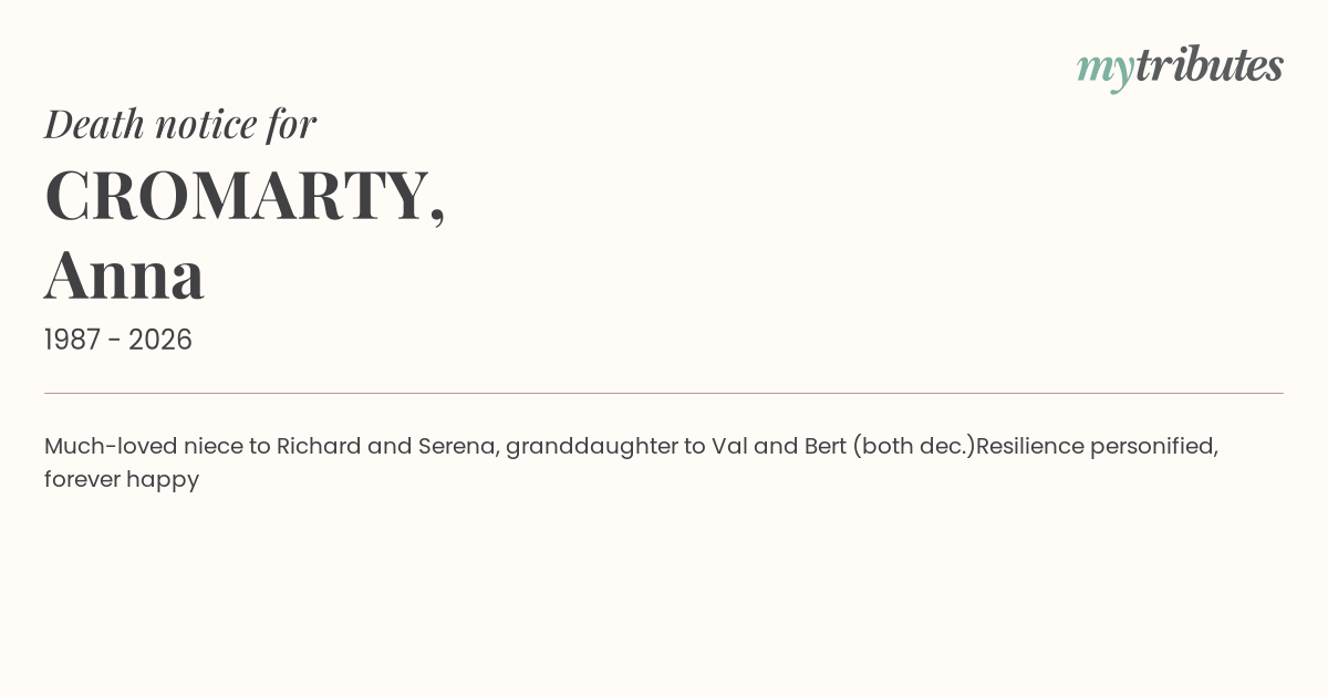 12°CMuch-loved niece to Richard and Serena, granddaughter to Val and Bert (both dec.)