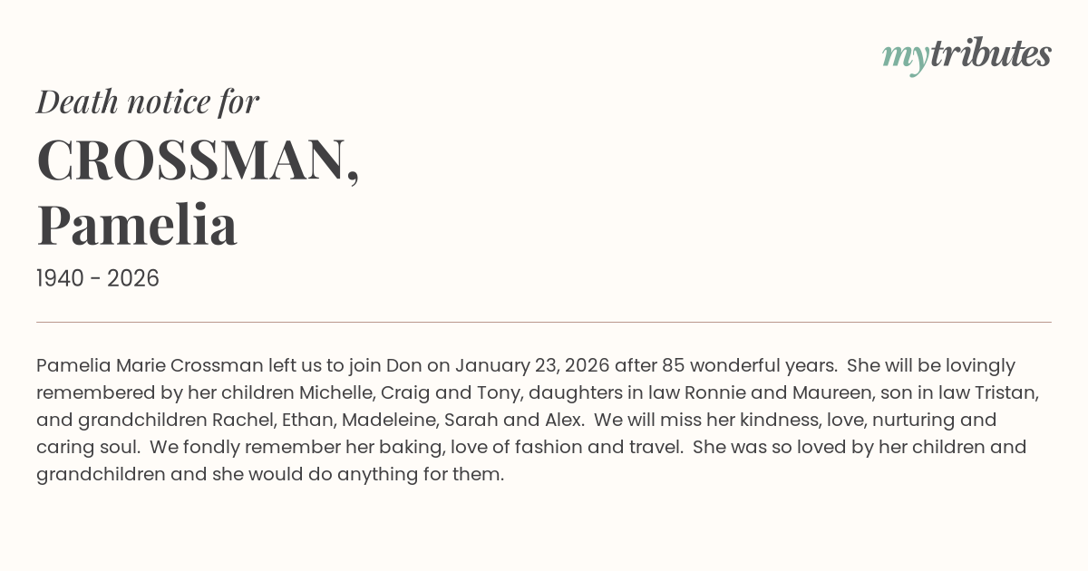12°CPamelia Marie Crossman left us to join Don on January 23, 2026 after 85 wonderful years. She will be lovingly remembered by her children Michelle, Craig and Tony, daughters in law Ronnie and Maureen, son in law Tristan, and grandchildren Rachel, Ethan, Madeleine, Sarah and Alex.