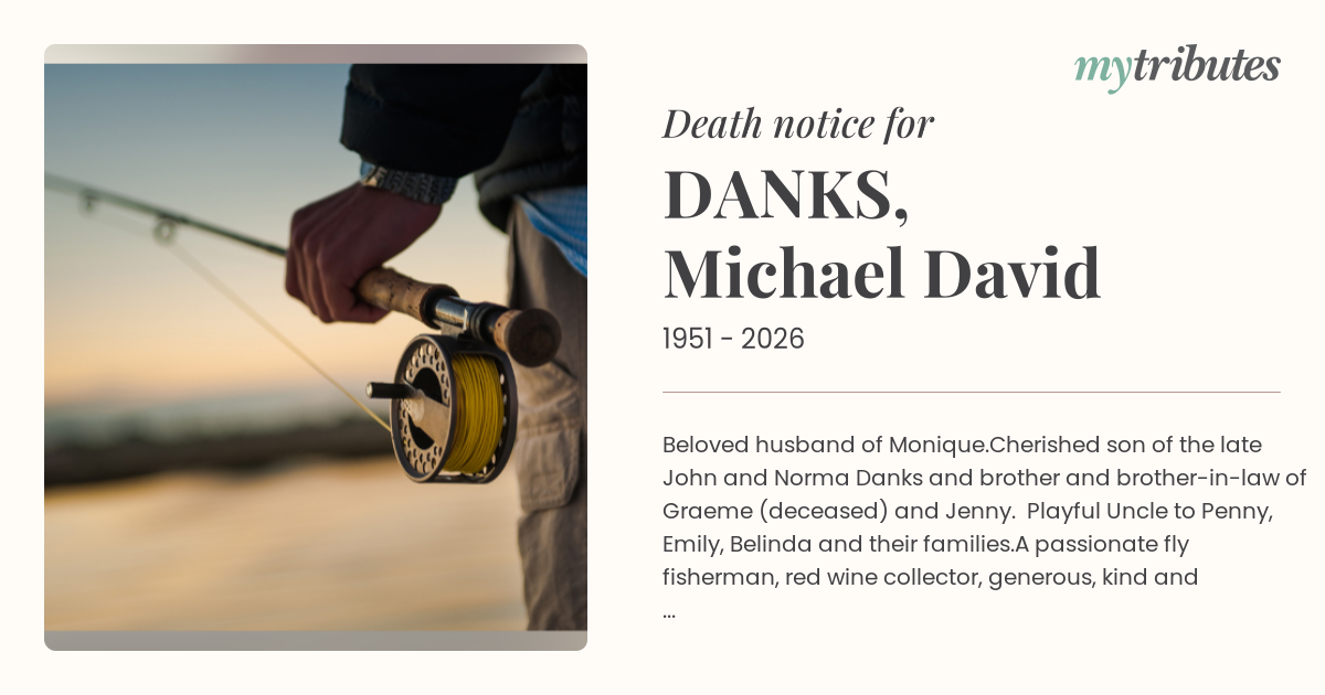 Cherished son of the late John and Norma Danks and brother and brother-in-law of Graeme (deceased) and Jenny. Playful Uncle to Penny, Emily, Belinda and their families.