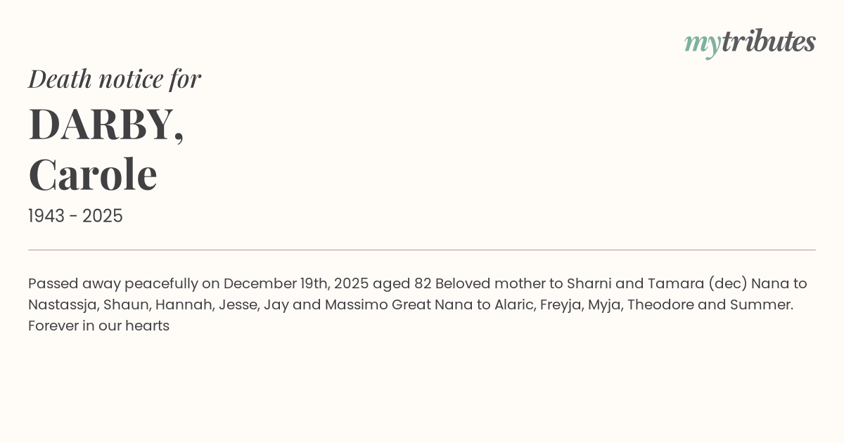12°CPassed away peacefully on December 19th, 2025 aged 82 Beloved mother to Sharni and Tamara (dec) Nana to Nastassja, Shaun, Hannah, Jesse, Jay and Massimo Great Nana to Alaric, Freyja, Myja, Theodore and Summer. Forever in our hearts