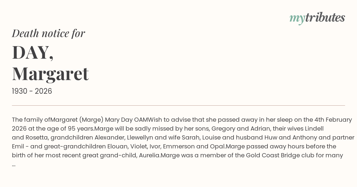 Marge will be sadly missed by her sons, Gregory and Adrian, their wives Lindell and Rosetta, grandchildren Alexander, Llewellyn and wife Sarah, Louise and husband Huw and Anthony and partner Emil - and great-grandchildren Elouan, Violet, Ivor, Emmerson and Opal.