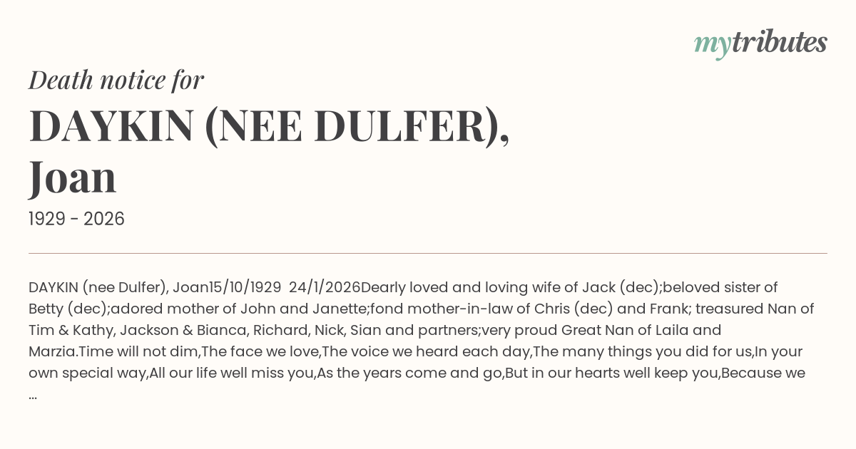 fond mother-in-law of Chris (dec) and Frank; treasured Nan of Tim & Kathy, Jackson & Bianca, Richard, Nick, Sian and partners;