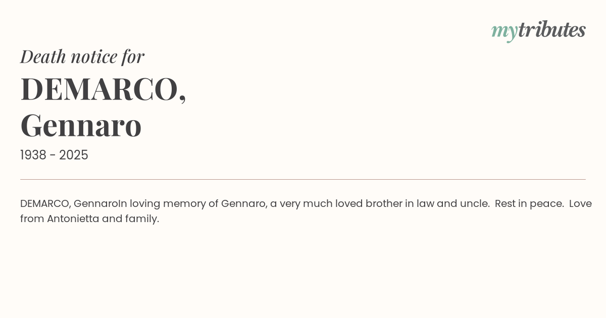 In loving memory of Gennaro, a very much loved brother in law and uncle. Rest in peace. Love from Antonietta and family.