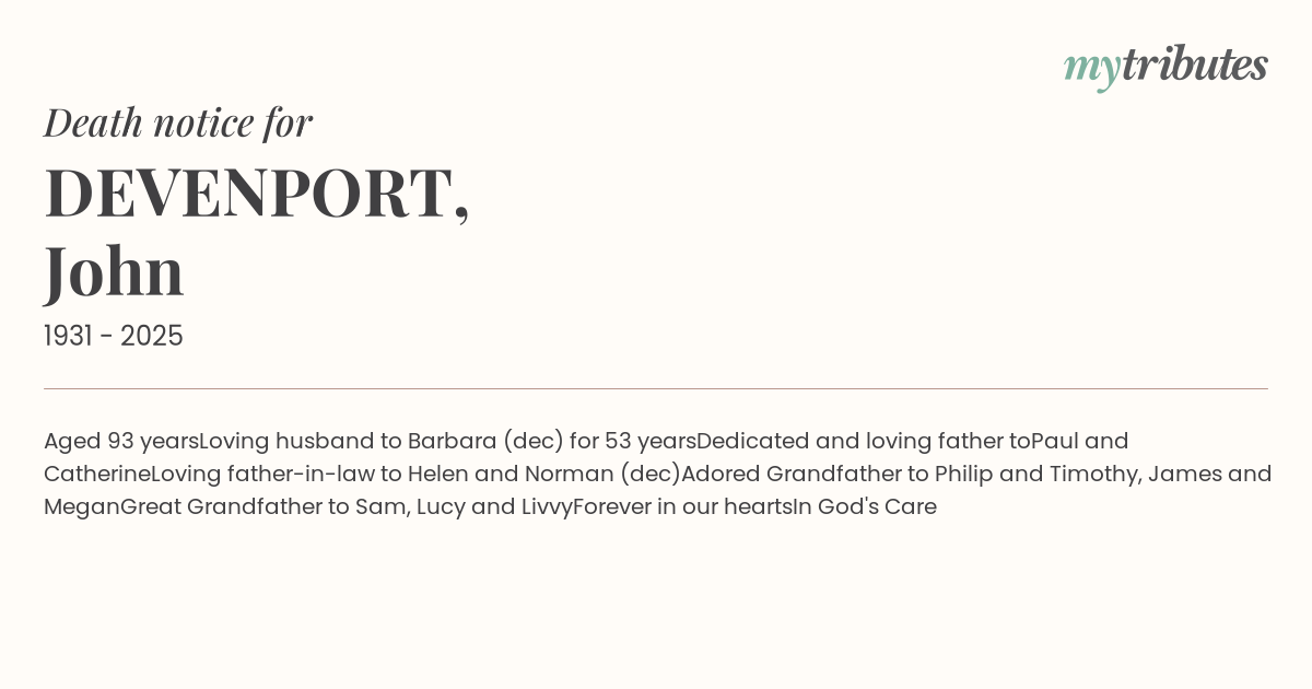 Loving husband to Barbara (dec) for 53 years