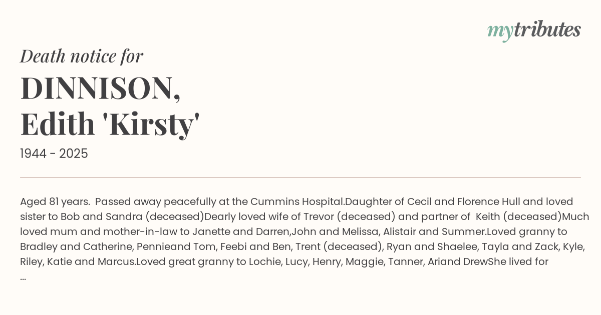 Much loved mum and mother-in-law to Janette and Darren,John and Melissa, Alistair and Summer.