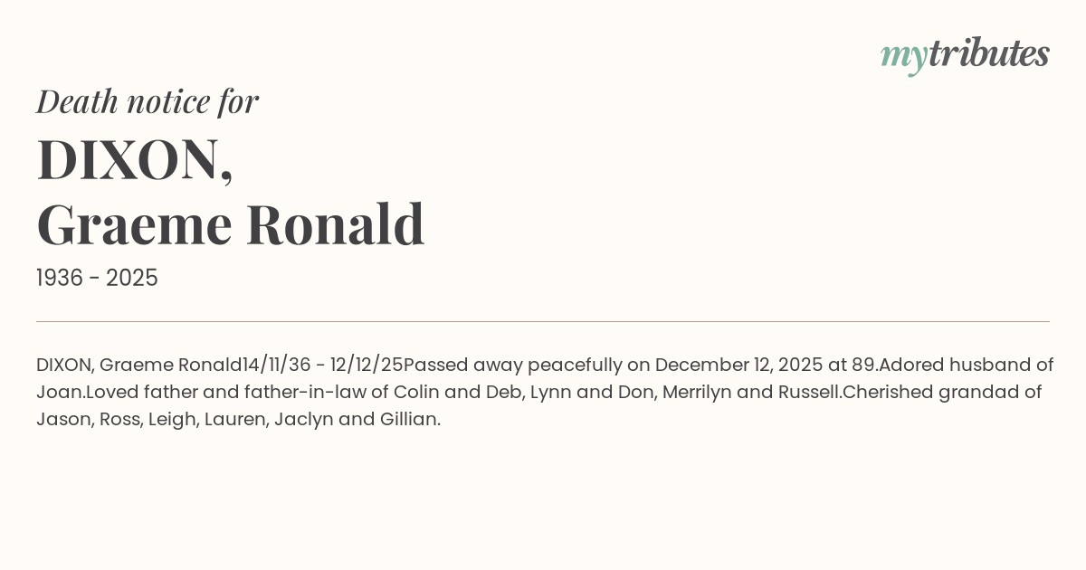 Cherished grandad of Jason, Ross, Leigh, Lauren, Jaclyn and Gillian.
