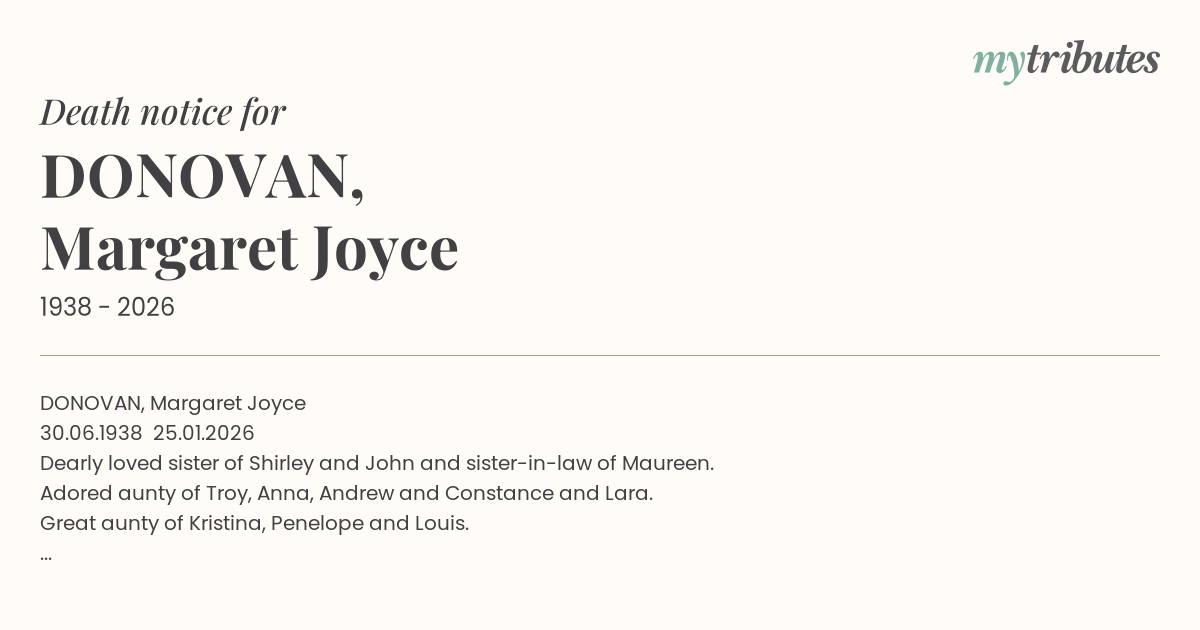 12°CDONOVAN, Margaret Joyce 30.06.1938 – 25.01.2026 Dearly loved sister of Shirley and John and sister-in-law of Maureen. Adored aunty of Troy, Anna, Andrew and Constance and Lara. Great aunty of Kristina, Penelope and Louis. Treasured memories are ours to keep.