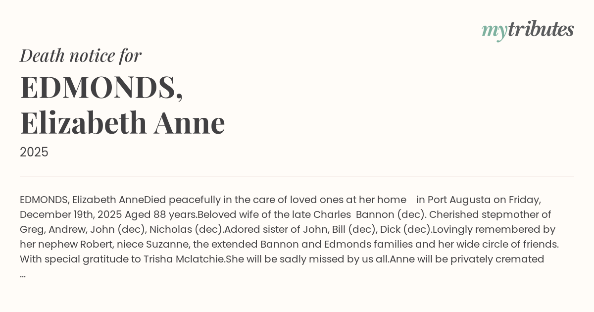 Died peacefully in the care of loved ones at her home in Port Augusta on Friday, December 19th, 2025