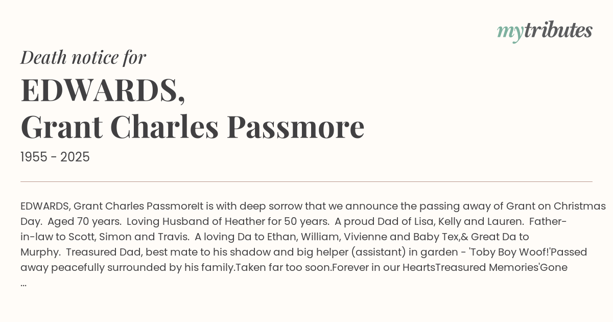 It is with deep sorrow that we announce the passing away of Grant on Christmas Day.