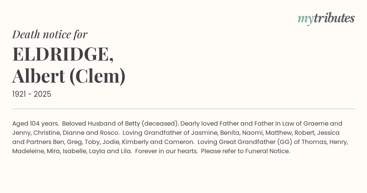 12°CAged 104 years. Beloved Husband of Betty (deceased). Dearly loved Father and Father In Law of Graeme and Jenny, Christine, Dianne and Rosco. Loving Grandfather of Jasmine, Benita, Naomi, Matthew, Robert, Jessica and Partners Ben, Greg, Toby, Jodie, Kimberly and Cameron. Loving Great Grandfather (GG) of Thomas, Henry, Madeleine, Mira, Isabelle, Layla and Lila. Forever in our hearts. Please refer to Funeral Notice.