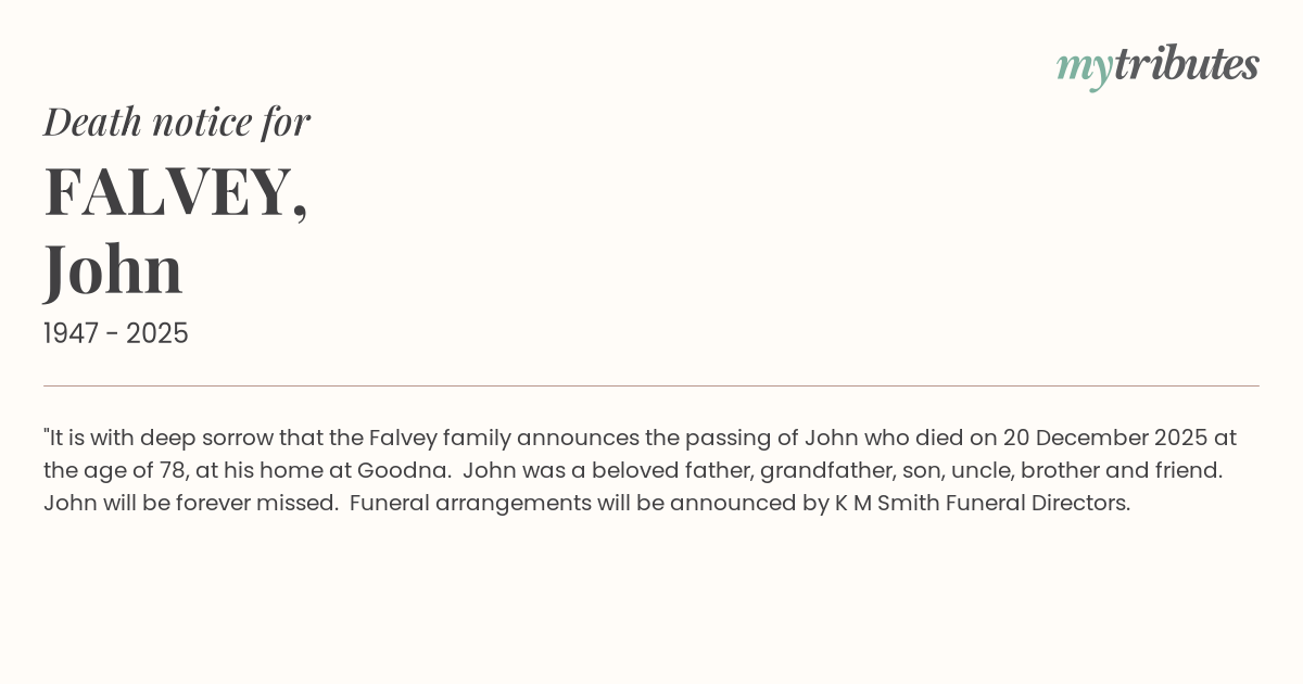 12°C"It is with deep sorrow that the Falvey family announces the passing of John who died on 20 December 2025 at the age of 78, at his home at Goodna. John was a beloved father, grandfather, son, uncle, brother and friend. John will be forever missed. Funeral arrangements will be announced by K M Smith Funeral Directors.