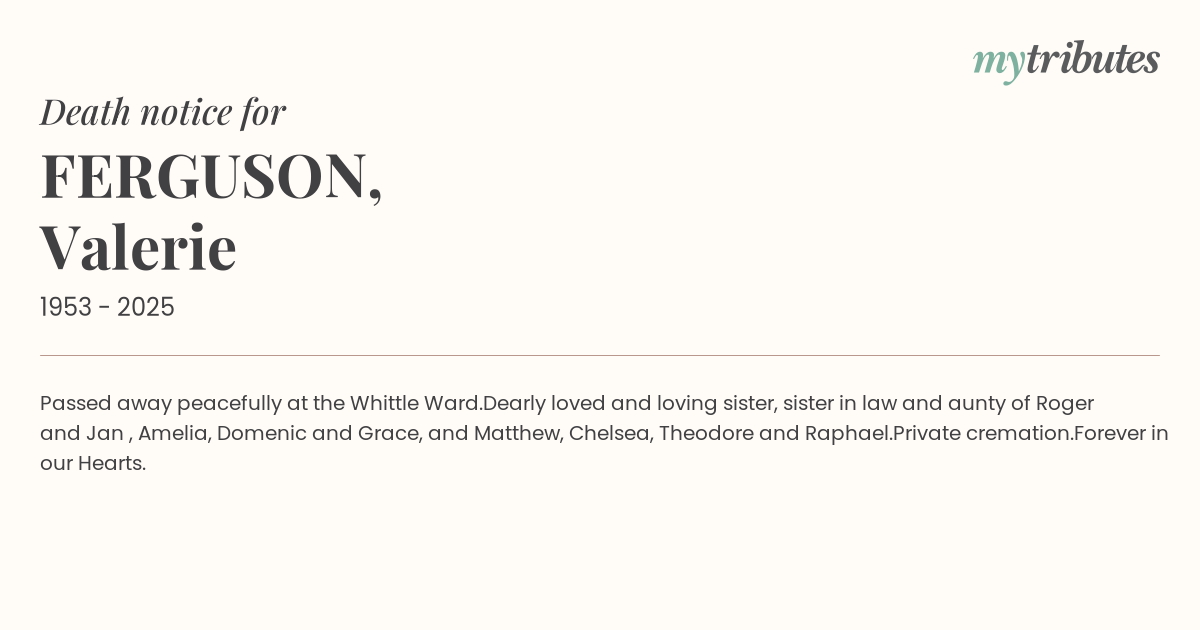 Dearly loved and loving sister, sister in law and aunty of Roger and Jan , Amelia, Domenic and Grace, and Matthew, Chelsea, Theodore and Raphael.